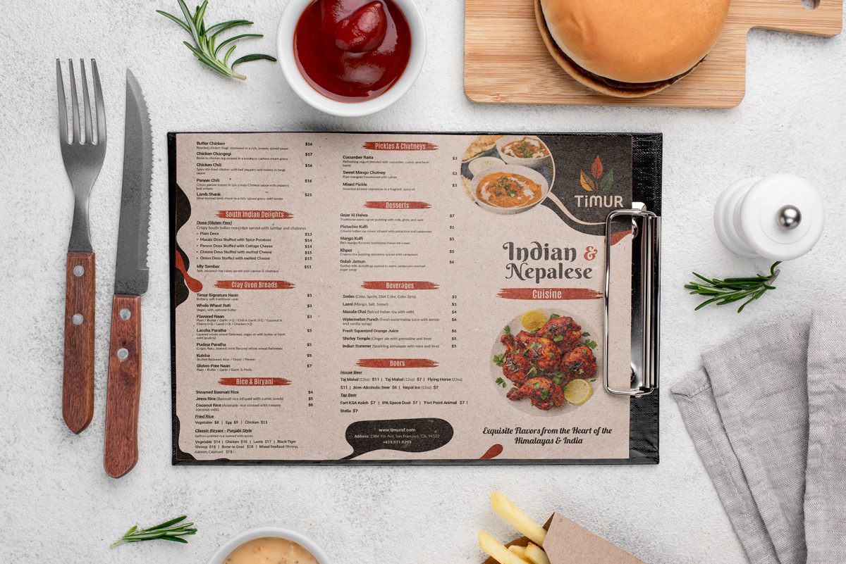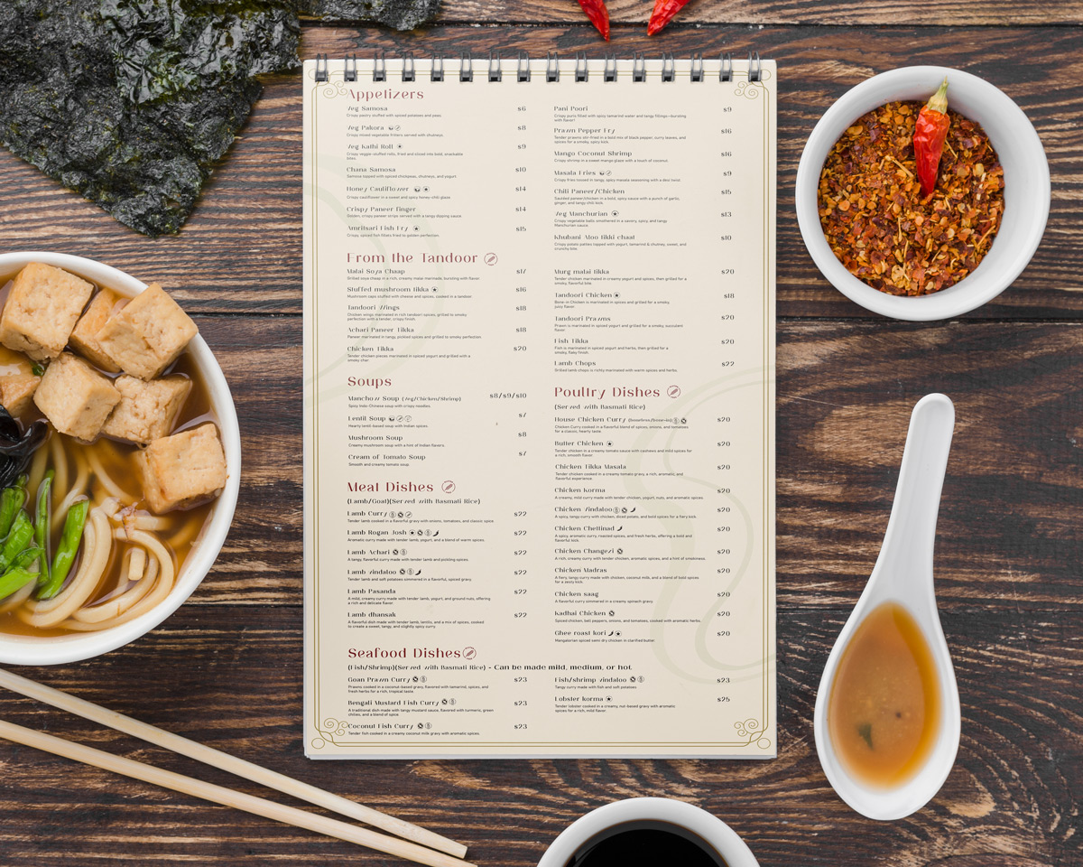 Custom Restaurant Food Menu Designer in Houston, Texas. Transform your food menu design with innovative layouts and visually appealing elements that showcase your dishes.
